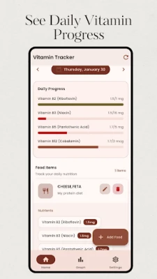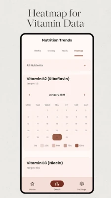 Vitamin Tracker biedt een intuïtieve en krachtige manier om zowel uw macro- als micronutriënteninname nauwkeurig te monitoren. Dankzij een uitgebreide voedingsmiddelendatabase en een gebruiksvriendelijk logboek krijgt u waardevolle inzichten die essentieel zijn voor uw gezondheid en welzijn. Dit is veel meer dan een standaard calorieteller; het is een diepgaande tool die u in staat stelt om uw voedingsstatus tot in detail te begrijpen.