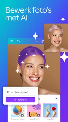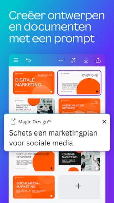 Ontdek de grensverleggende 'magie' die diep in de kern van Canva verweven zit. Dankzij geavanceerde AI-functionaliteiten wordt ontwerpen een betoverende ervaring. Upload een afbeelding en laat Magisch Ontwerpen van Canva automatisch verbluffende lay-outs genereren. Pas moeiteloos elementen aan met Magisch Bewerken, wis ongewenste objecten met de Magische Gum, en doorbreek taalbarrières door ontwerpen automatisch te vertalen naar meer dan 100 talen. Bovendien biedt Canva een krachtige fotobewerker voor het perfectioneren van beelden en een uitgebreide videobewerker om boeiende verhalen te componeren met professionele finesse.