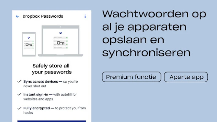 Deel moeiteloos omvangrijke bestanden met vrienden, familie of collega's, ongeacht of zij een Dropbox-account hebben. Met een simpele link is samenwerken nog nooit zo eenvoudig geweest. En met de ingebouwde scanner zet u documenten, bonnetjes of identiteitsbewijzen direct om in heldere PDF's, klaar voor verzending of archivering. Voor uw computer biedt Dropbox een krachtige synchronisatiefunctie, waarmee mappen van uw pc of Mac veilig worden geback-upt en u met Dropbox Rewind zelfs tot 30 dagen terug kunt in de tijd om per ongeluk verwijderde bestanden te herstellen of eerdere versies op te halen. Hiermee maakt u niet alleen extra opslagruimte vrij, maar beheert en deelt u ook eenvoudig gezins- en videoalbums.