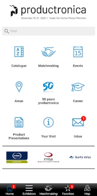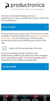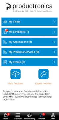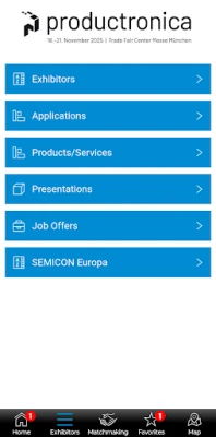 Met de **productronica app 2025** navigeert u met ongekend gemak door het aanbod. Zoek doelgericht naar exposanten, specifieke producten, innovatieve diensten, of relevante toepassingengebieden, en raadpleeg de volledige evenementenagenda. U kunt moeiteloos persoonlijke favorietenlijsten samenstellen en direct toegang krijgen tot de exclusieve producthighlights van de exposanten. Deze lijsten synchroniseren bovendien naadloos met uw online catalogus, wat betekent dat uw voorbereidingen altijd up-to-date zijn, waar u ook bent. Leg waardevolle contactgegevens direct vast in een handig adresboek en benut de intelligente matchmaking-functie om relevante connecties te maken.
